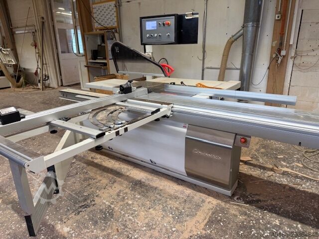 Sliding table: 3200 mm, cutting width: 1000 mm, CNC parallel fence, scoring unit, angle stop with digital display, electro-motorically tiltable and height adjustable, control panel at eye level. Storage locatio ..... read more